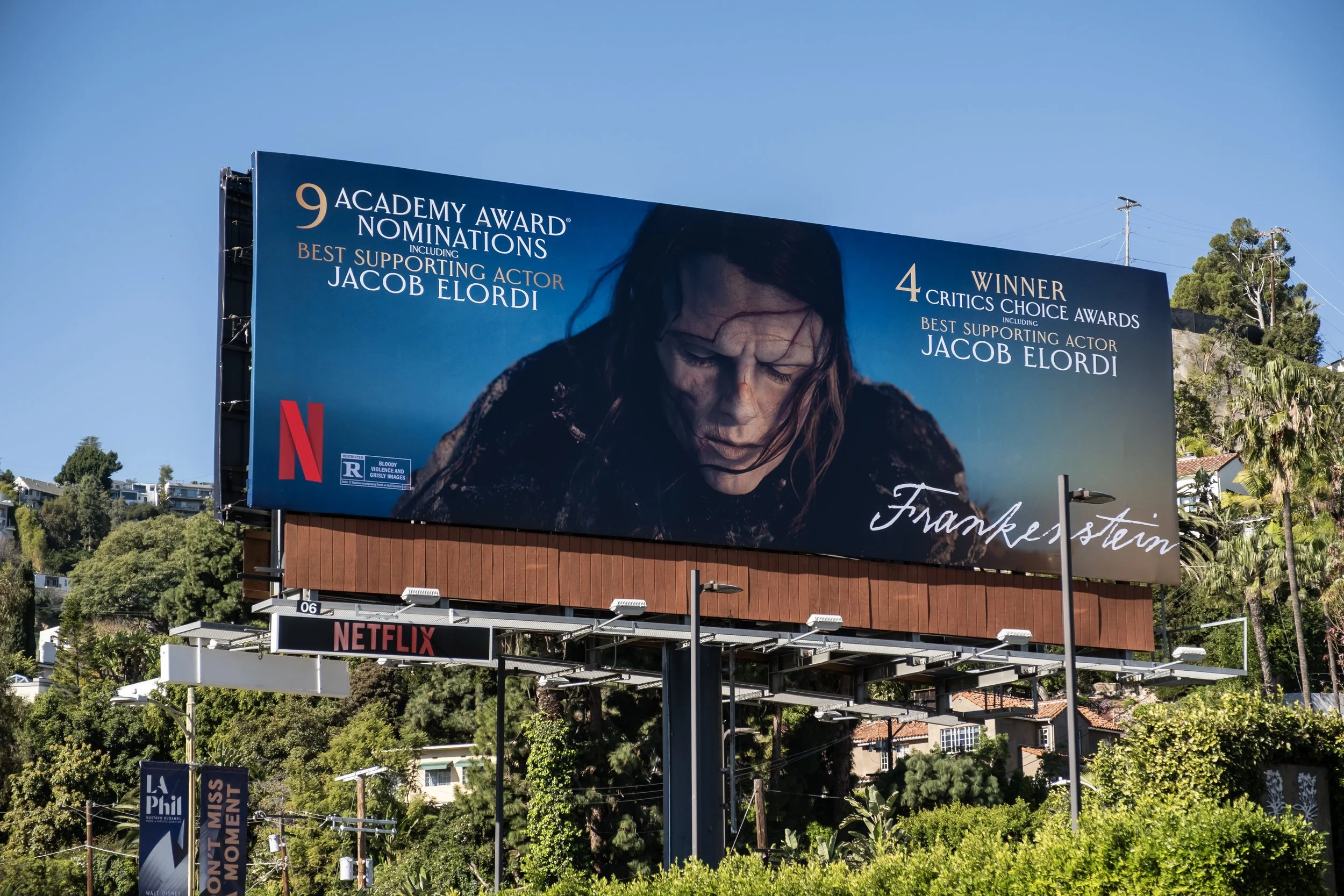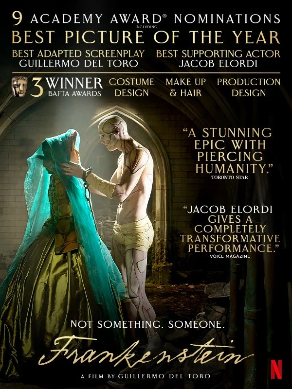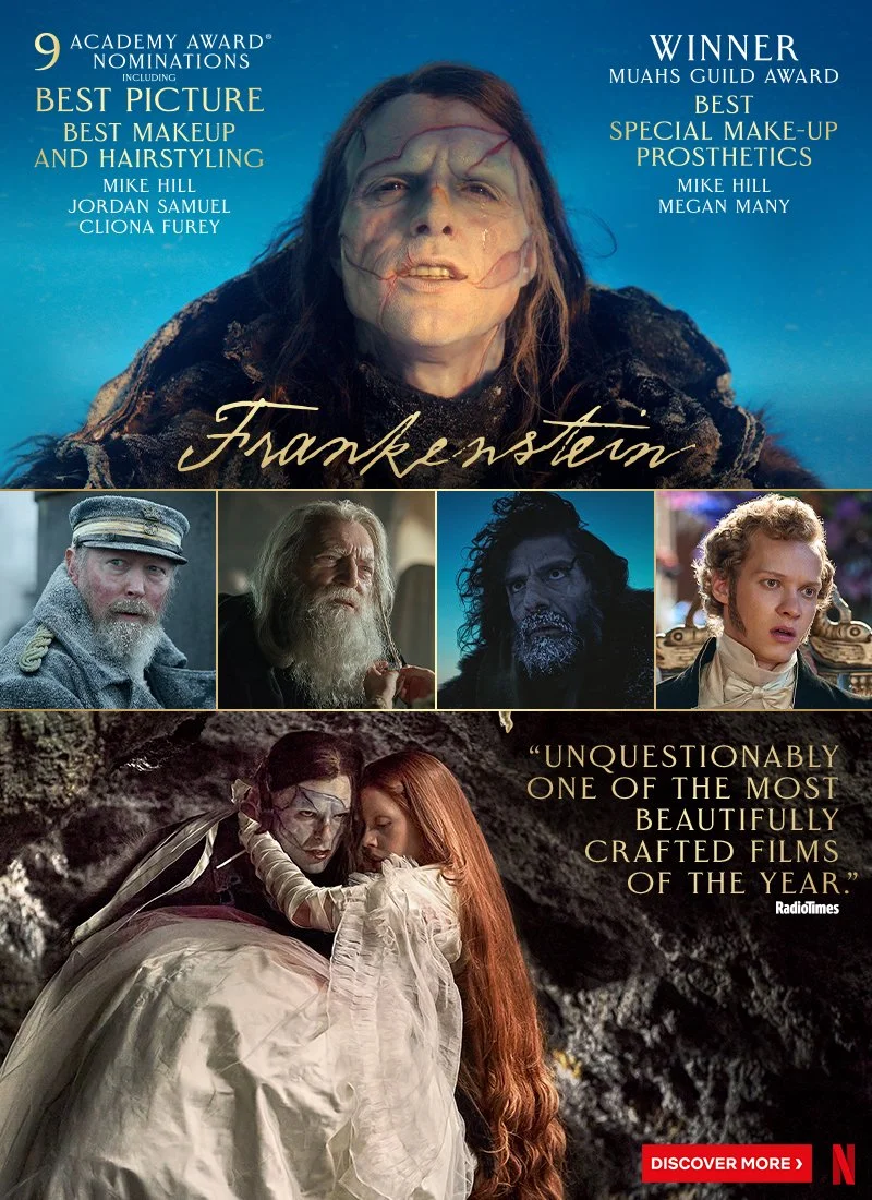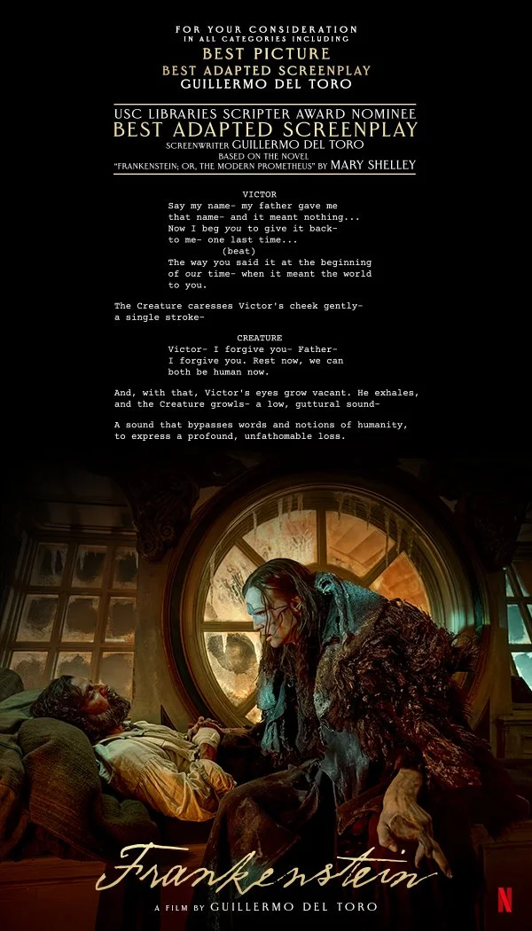 Supported creative strategy and direction for the awards campaign of Netflix’s Academy Award-winning Frankenstein, with particular focus on image curation and selection. Campaign spanned OOH, trade, newspaper, digital placements, exterior building branding, critics mailers, and TV + podcast spots.