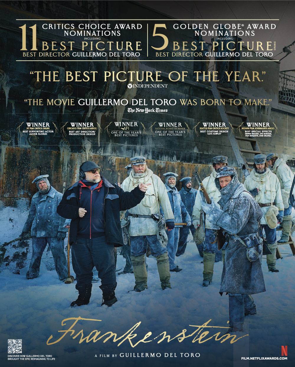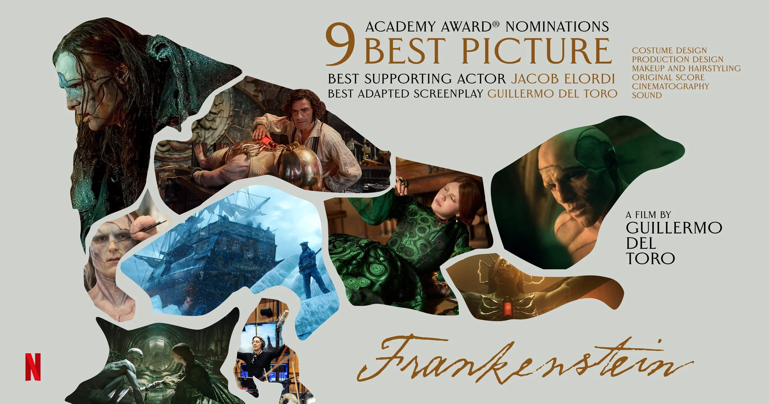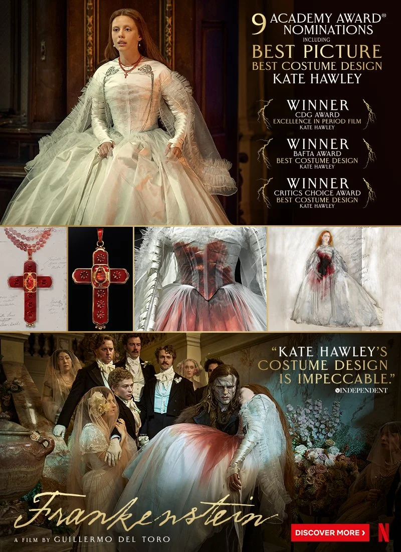 Supported creative strategy and direction for the awards campaign of Netflix’s Academy Award-winning Frankenstein, with particular focus on image curation and selection. Campaign spanned OOH, trade, newspaper, digital placements, exterior building branding, critics mailers, and TV + podcast spots.