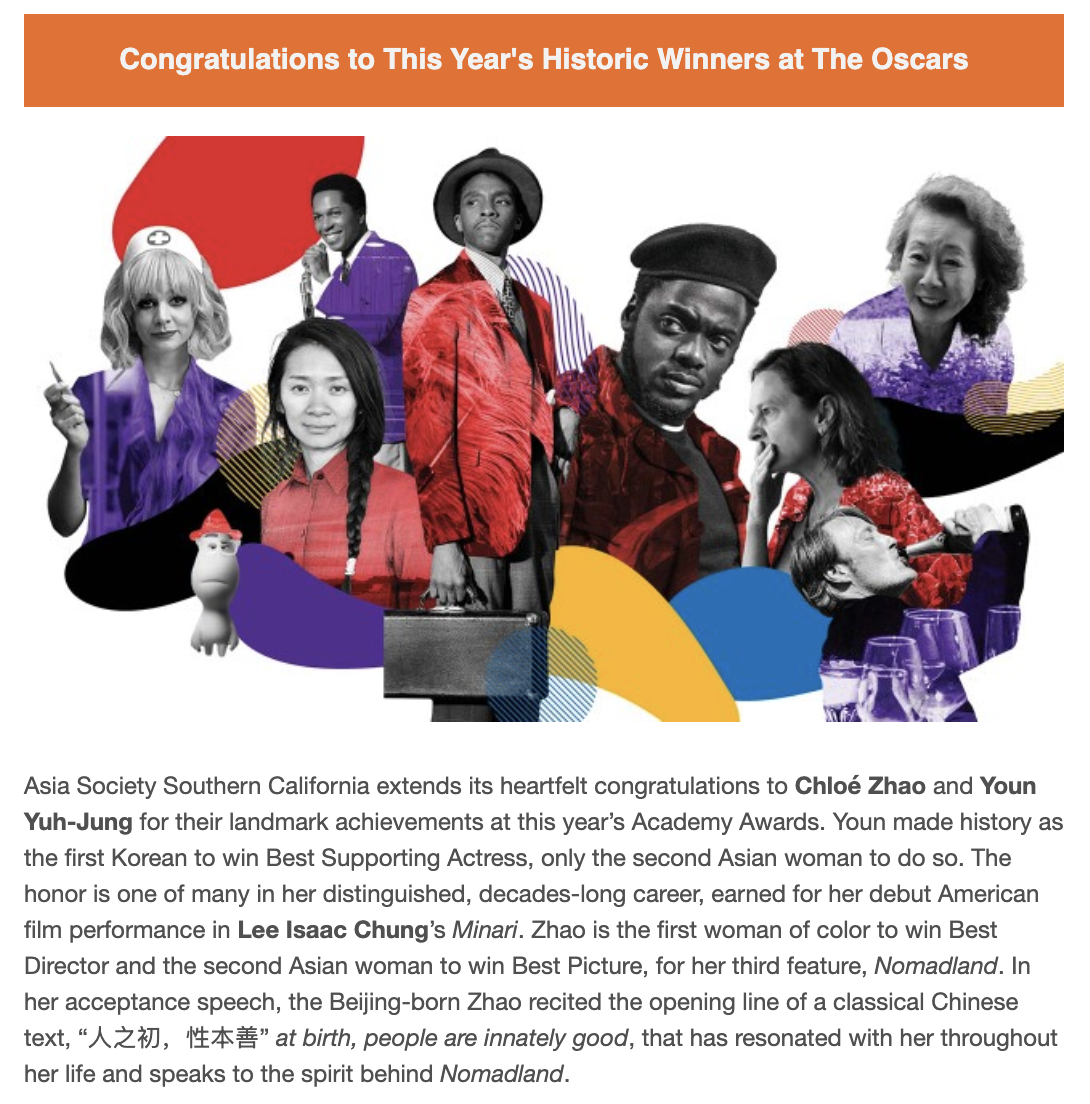 Integral member of the planning and execution of Asia Society Southern California’s 2021 U.S.-Asia Entertainment Summit, 2021 launch of the Asian Women Empowered initiative, and 2022 Annual Gala. Created all social graphics, event invitations, and brochures, along with writing website and email newsletter copy and doing occasional video editing and translation work.