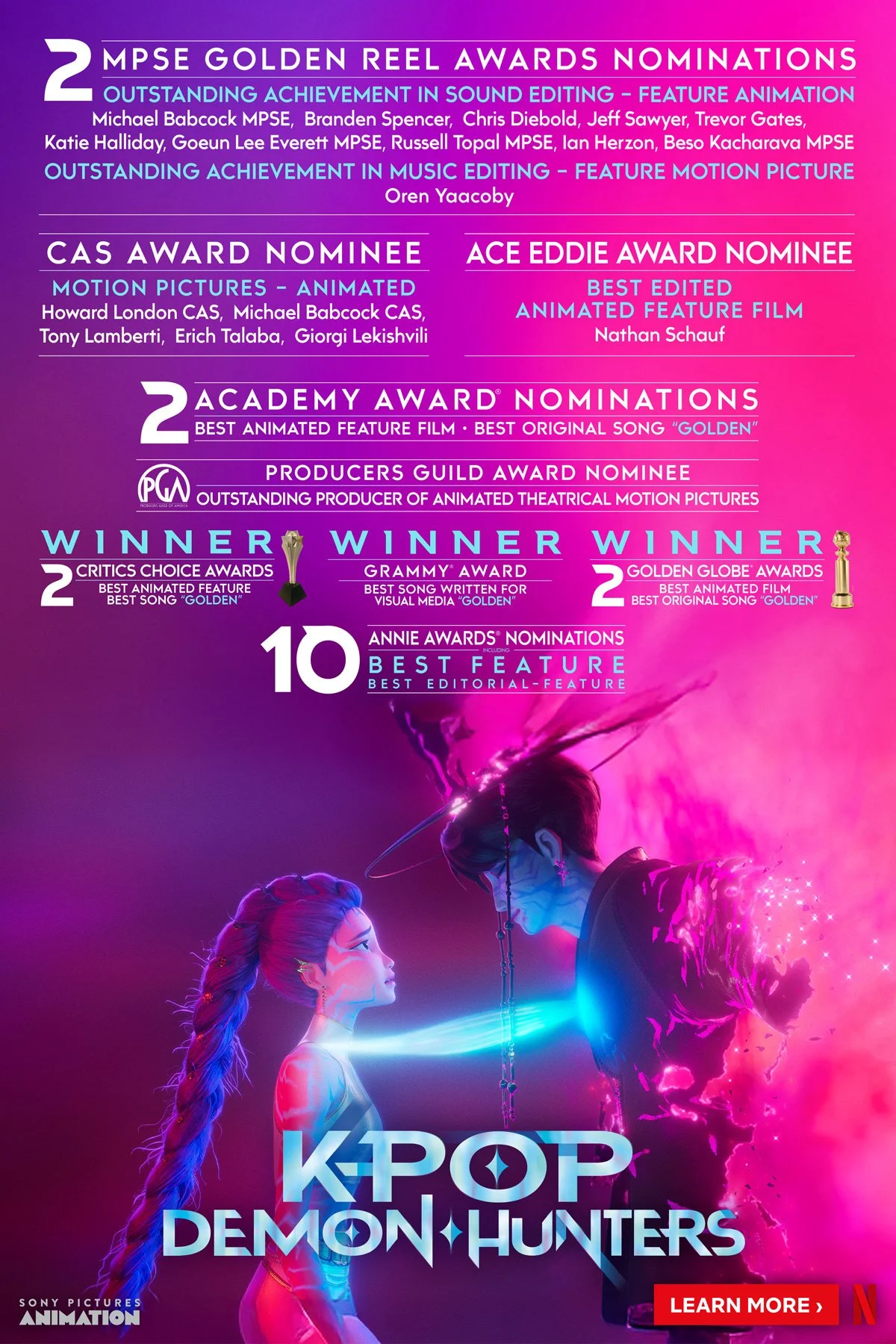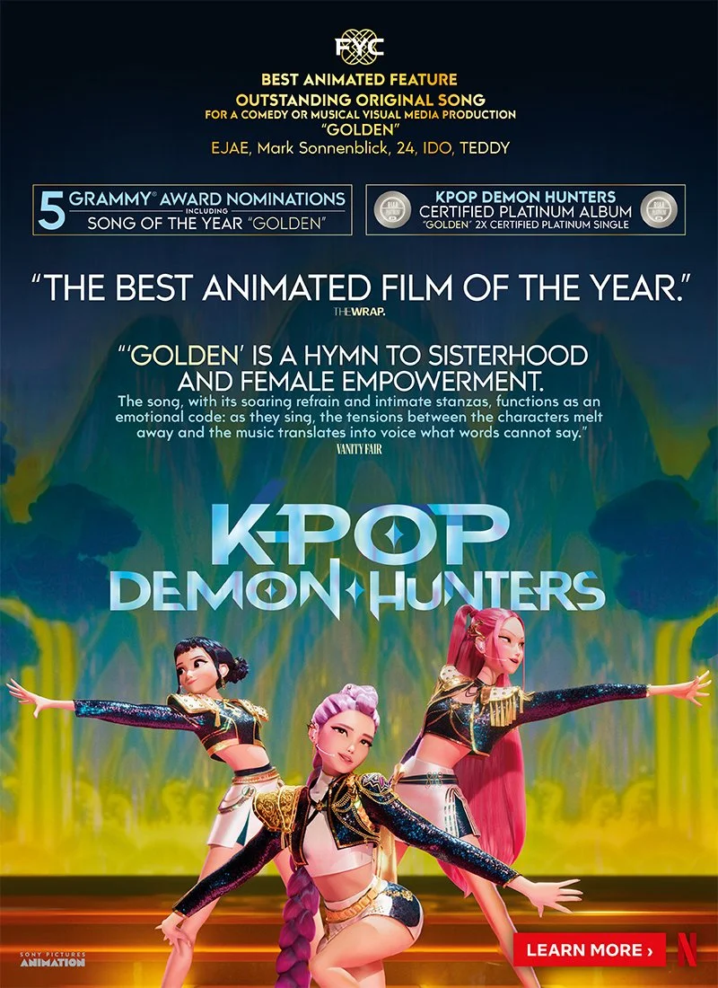 Provided creative strategy and direction for the awards campaign of Netflix’s Academy Award-winning KPop Demon Hunters, inclusive of OOH, trade, digital placements, TV + podcast spots, and custom merch. Collaborated with filmmakers and artists as well on The Art of KPop Demon Hunters book.